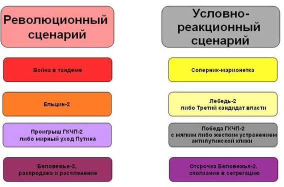 Первый сценарий может быть назван революционным (Беловежье-2), второй - условно-реакционным (ГКЧП-2), использующим патриотическую риторику в стиле более или менее близком собравшимся на круглом столе в ИДК, посвященном путям самоорганизации национально-имперских сил и собиранию Русской коалиции.
