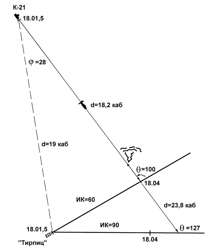 Давайте размышлять по-мужицки. У нас получается треугольник, скорее всего прямоугольный или близкий к таковому. В одной вершине на момент пуска торпед находился «Тирпиц», плывущий поперек курса К-21 и поперек курса выпущенных ею торпед. В другой вершине сама К-21, и в третьей вершине курсы торпед и «Тирпица» должны были пересечься. Если они пересекутся в примерно одно и то же время после пуска торпед, значит Лунин в «Тирпиц» попал, поскольку торпедам в той точке просто не во что, кроме борта «Тирпица», было удариться, чтобы взорваться.