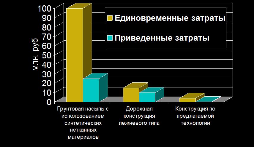На рисунке - средняя сметная стоимость (единовременные затраты) и приведенные затраты (с учетом срока службы) 1 км дороги при ширине проезжей части 16 м на болоте 2-го типа глубиной 8-10 м в регионе Западная Сибирь в российских ценах 2007 года. (Стоимость предлагаемой конструкции не зависит от типа и глубины болот)