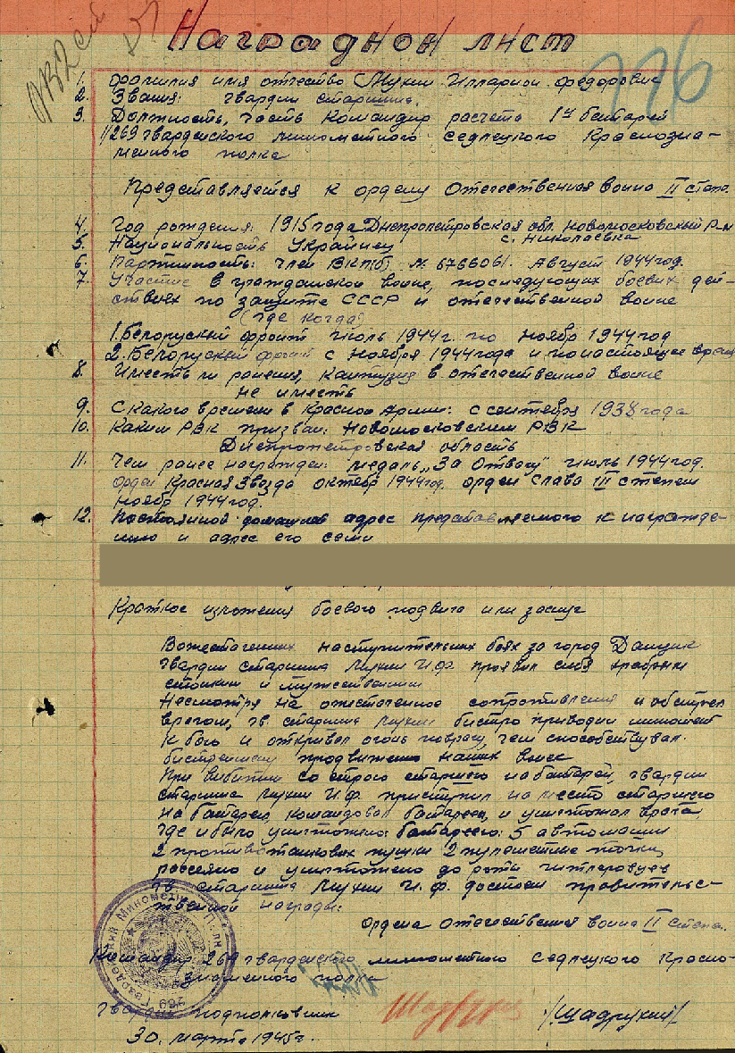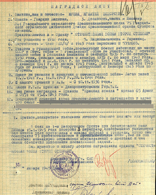 Между прочим, то, что этим командующим армией, вынувшим орден из кармана, был П.И. Батов, я уже потом сам выяснил. Батов, кстати, и подписал наградной лист на обороте, а эта его подпись свидетельствует о том, что расход орденских знаков был произведен именно в 65-й армии, а не в дивизии, командир которой тоже имел право единолично награждать этим орденом.